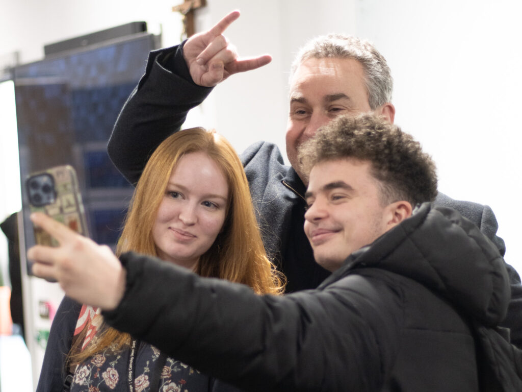 Daeth yr ymweliad i ben ar nodyn ysgafnach, gyda Hugo yn hapus yn sefyll am hunluniau gyda myfyrwyr ac yn sgwrsio’n anffurfiol am ei brofiadau, gan wneud y gorau o’i ddychweliad i’w amgylchedd cyfarwydd.